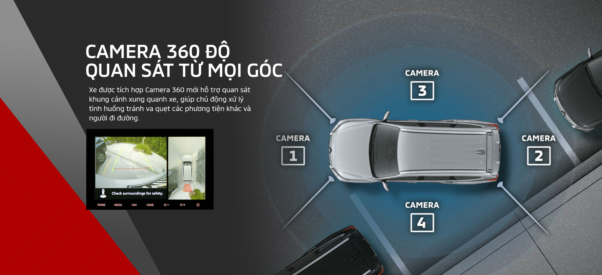 Cho phép quan sát xung quanh thân xe sẽ giúp cho các tài xế dễ dàng thấy được những vật nằm trong góc khuất, điểm mù; hỗ trợ thuận lợi cho việc lùi và đỗ xe an toàn.